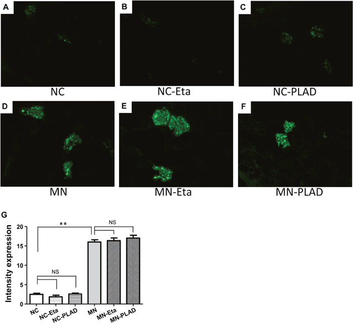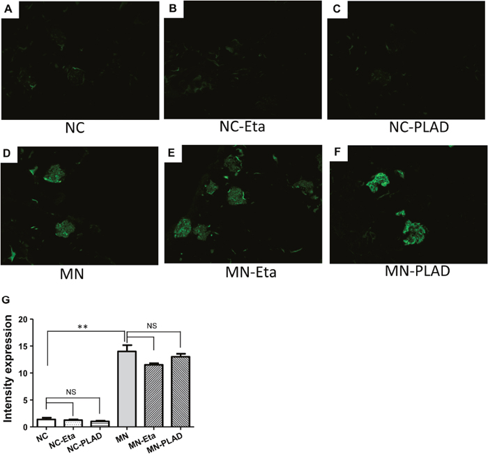 Figure 3: Changes in renal histopathology in mice with experimental MN shown by immunofluorescence staining for IgG. Mice in the NC group (A–C) and MN group (D–F) were treated with PBS (A and D), etanercept (MN-Eta; B and E), or preligand assembly domain fusion protein (MN-PLAD; C and F), and quantitative data for immunofluorescence staining of IgG are shown in (G).