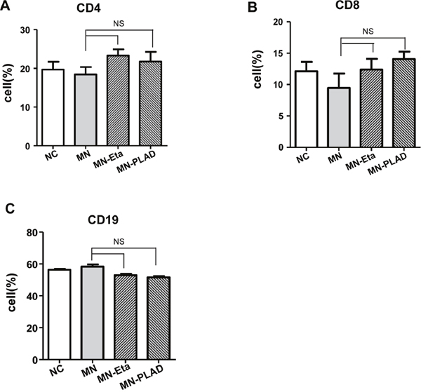 Figure 5: Distribution of lymphocyte subsets in spleens from mice with experimental MN. The percentages of immune cells including (A) CD4, (B) CD8, and (C) CD19 as assessed by flow cytometry did not change significantly in mice from the NC, MN, and MN groups treated with etanercept (Eta) or preligand assembly domain fusion protein (PLAD).