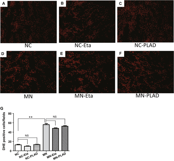 Oxidative stress has been shown to play an important role in the development and progression of MN. We detected the production of superoxide anion radical in kidneys (Figure 6A–6G). The level of DHE fluorescence was low in NC mice and was significantly higher in MN mice; no attenuation of fluorescence was observed in MN mice treated with etanercept or MN-PLAD. These findings suggested that there are increased production of ROS in MN kidneys and that inhibition of TNF did not attenuate this effect.