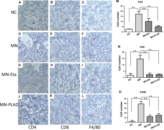 To investigate the effects of inhibition of TNF on immune cell infiltration in kidney in cBSA-induced MN, we used IHC to identify renal immune cells in mice from the NC group (A–C), and MN group (D–L) receiving PBS (D-F), etanercept (MN-Eat; G-I) and PLAD.Fc (MN-PLAD; J-L). Subgroups of immune cells including CD4+ T cells (Figure 7A, 7D, 7G, 7J), CD8+ T cells (Figure 7B, 7E, 7H, 7K), and F4/80 monocytes (Figure 7C, 7F, 7I, 7L) were analyzed. F4/80+ macrophages were the most abundant inflammatory cells found in glomeruli. By contrast, both the MN-Eta and MN-PLAD groups showed significantly less infiltration of immune cells.