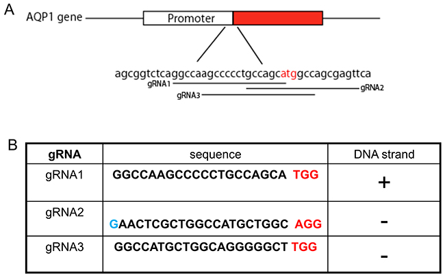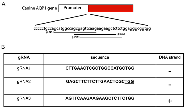 Figure 7: Guided RNA design for the canine AQP1. (A) The location of three gRNAs of canine AQP1 geneisindicated and the start codon ATG is highlighted in red. (B) The sequence of gRNAs and the chromosome targeting orientation along with the PAM sequence (underlined).