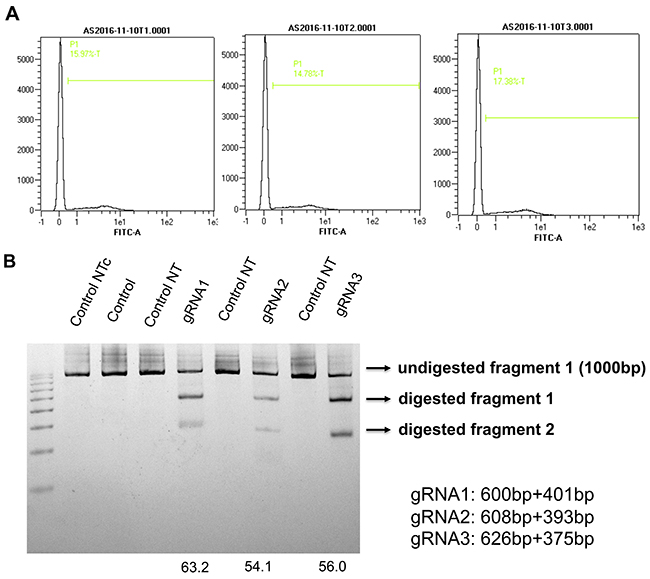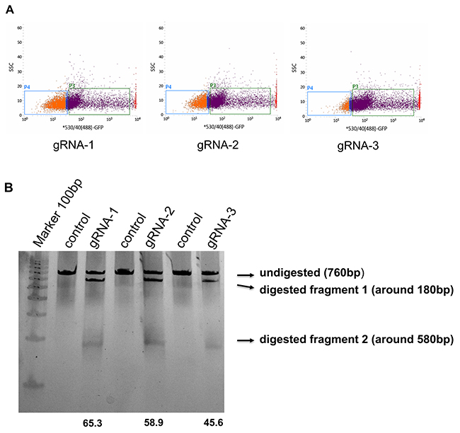 First, we sought to find three potentialgRNA sequences to induce DSBs within the vicinity of AQP1transcription start site(TSS) using the CRISPR design tool (Figure 1). Vectors (PX458 with green fluorescent protein (GFP)) expressing these gRNAs were transfected into HEK293 cells. Using flow cytometry techniques, we found the sorting efficiency to be similar for the three separate gRNA sequences (Figure 2A).