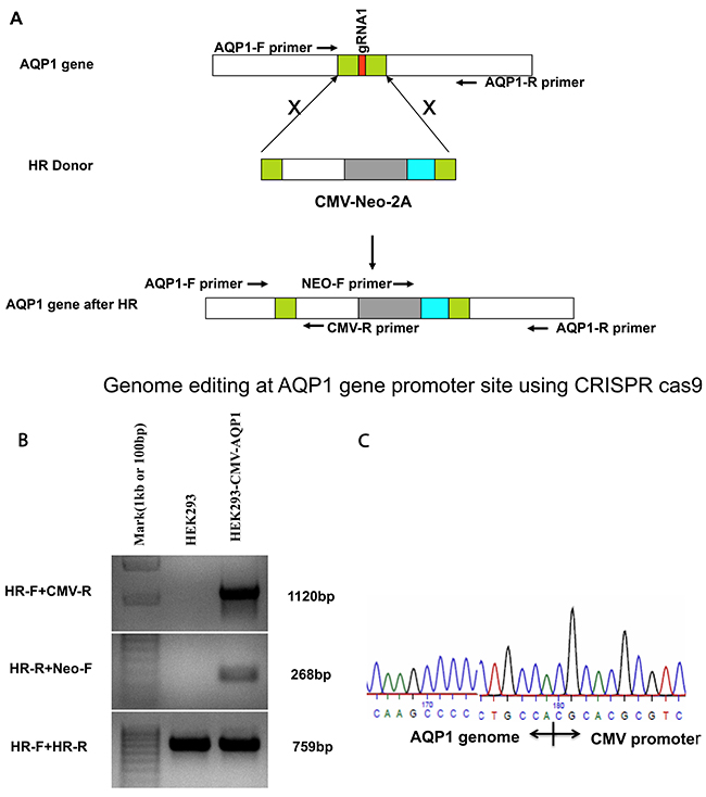 Figure 4: Genome editing at the AQP1 gene promoter site using CRISPR-Cas9 and establishing the integrated stable cell line of HEK293. (A) Schematic to introduce the CMV-Neo-2A expression cassette into AQP1 genome locus. Genome editing at the AQP1 gene primers pairs of AQP1 and CMV-R, Neo-F and AQP1-R were used to detect the insertion of expression cassettes, respectively. Primer pair of AQP1-F andAQP1-R was used to confirm the AQP1 gene locus breaks of both alleles. (B) Control DNA from HEK293 cells (Lane 2: negative control) and primers shown in (A) were amplified with stable cell DNA (Lane 3). (C) The amplified fragment using primer HR-F and CMV-R (Lane 3 in (B)) was isolated by gel extraction and sequenced to confirm the CMV promoter integrated appropriately.