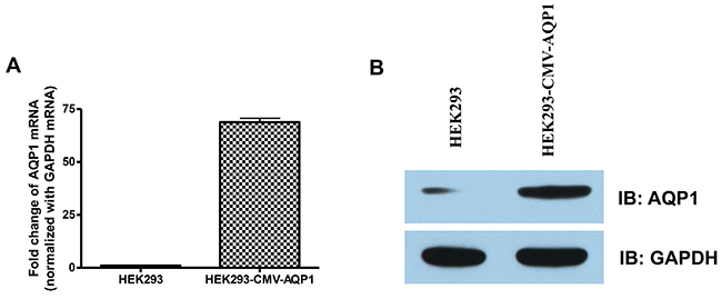 Figure 5: Detection of AQP1 expression in the stable HEK 293 cells. HEK293 and HEK293-CMV-AQP1 cells were collected. The AQP1 (A) mRNAtranscription levels were quantified using RT-QPCRand (B) protein levels were quantifiedusing Western blotting.