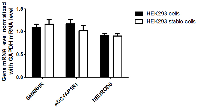 Figure 6: Detection of AQP1 downstream gene (GHRHR, ADCYAP1R1 and NEUROD6) expression in stable HEK 293 cells. HEK293 and HEK293-CMV-AQP1 cells were collected and the mRNA levels of the genes were analyzed. The relative level of the three genes in each sample was normalized to GAPDH expression (control = 1). The experiment was run in triplicate.