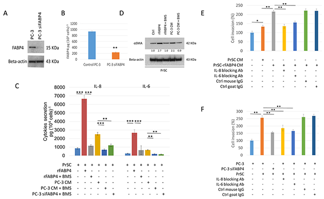 Figure 1: Expression and secretion of FABP4 promotes PCa invasiveness by activating PrSC to produce proinflammatory cytokines. (A and B) Expression and secretion of FABP4 in PCa cells. Overall, 1 × 105 PC-3 cells were cultured in a 35-mm dish, and treated with or without 50 nM FABP4 siRNA-1 for 24 hours. Equal amounts of proteins (10 μg) from the cultured cells were subjected to anti-FABP4 and anti-beta-actin staining (A). The mean FABP4 level in the conditioned medium (CM) was significantly lower in PC-3 cells treated with FABP4 siRNA-1 (235.4 ± 11.6 pg per 105 cells) compared with control PC-3 cells (938.8 ± 29.0 pg per 105 cells) (P = 0.007, B). **P < 0.01. (C) Cytokine secretion of PrSC cells stimulated with FABP4. Overall, 2 × 104 PrSC cells were treated with or without 100 ng ml-1 rFABP4 or PC-3 conditioned medium (PC-3 CM) obtained from (A), in the presence or absence of 30 μM BMS309403 (BMS) for 24 hours. IL-8 and IL-6 levels were significantly higher in PrSC treated with rFABP4 or PC-3 CM (6662.0 ± 457.1 and 2678.1 ± 342.4 pg (104 cells)-1, P = 0.0003 and P = 0.0002; and 2506.1 ± 218.7 and 654.8 ± 51.0 pg (104 cells)-1, P = 0.0044 and P = 0.021; respectively), and the effect was markedly inhibited in the presence of BMS309403. In addition, IL-8 and IL-6 levels were significantly lower in the conditioned medium of PrSC cultured in PC-3 CM treated with FABP4 siRNA-1 compared with untreated PC-3 CM. Mean ± S.D., **P < 0.01, ***P < 0.001. (D) Western blotting using anti-αSMA and anti-beta-actin antibodies of PrSC proteins treated with various agents described in (C). (E and F) PrSC augmented PC-3 cell invasiveness by secreting IL-8 and IL-6 in response to FABP4 secreted by PC-3 cells. (E) The relative value (%) of in vitro Matrigel invasion assay under each conditioned media is shown based on PC-3 cells with PrSC CM. PrSC-rFABP4 CM: conditioned media of PrSC treated with 100 ng ml-1 rFABP4. IL-8 blocking Ab: conditioned media of PrSC treated with rFABP4 in the presence of neutralizing IL-8 antibodies. IL-6 blocking Ab: conditioned media of PrSC treated with rFABP4 in the presence of neutralizing IL-6 antibodies. Ctrl mouse IgG: conditioned media of PrSC treated with rFABP4 in the presence of isotype control mouse IgG. Ctrl goat IgG: conditioned media of PrSC treated with rFABP4 in the presence of isotype control goat IgG. (F) The relative value (%) of in vitro Matrigel invasion assay under each condition is shown based on the condition with PrSC cells cultured in the lower chamber. PC-3: PC-3 cells were placed in the upper chamber. PC-3 siFABP4: FABP4 siRNA1 treated PC-3 cells were placed in the upper chamber. PrSC: PrSC cells were seeded in the lower chamber. IL-8 blocking Ab, IL-6 blocking Ab, Ctrl mouse IgG, and Ctrl goat IgG as shown in (E). Bar plots represent the percentage of invading cells relative to the invasion of PC-3 with PrSC cells cultured in the lower chamber. Mean ± S.D., *P < 0.05, **P < 0.01.