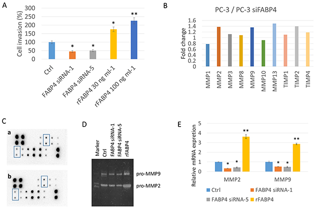 Figure 2: FABP4 directly stimulates PCa cell invasiveness by the upregulation of MMP2 and MMP9. (A) Histogram showing the relative value (%) of invading cells of each condition based on untreated PC-3 cells. PC-3 cells were treated with 50 nM FABP4 siRNAs or rFABP4 at the indicated concentration. All invading cells were counted and compared with untreated PC-3 cells (Ctrl); *P < 0.05 and **P < 0.01. (B, C, D and E) Altered matrix metalloproteinase (MMPs) levels by FABP4. (B and C) Overall, 1 × 105 PC-3 cells were cultured in a 35-mm dish, and treated with 50 nM FABP4 siRNA-1. Each conditioned medium (CM) was then collected and analyzed for MMP levels using the RayBio Human MMP Antibody Array kit. The signal intensity in the array images was quantified and scored by Densitograph software (ATTO). Fold changes among samples were analyzed and compared using RayBio Antibody Array Analysis Tool provided by RayBiotech (B). MMP2 and MMP9 signals in the array images are indicated by rectangular boxes (C). Fold changes of signals in control PC-3 cells (upper) and FABP4 siRNA-1 treated PC-3 cells (lower) were analyzed using the RayBio Antibody Array Analysis Tool (C). (D) Zymography analysis of MMP2 and MMP9 activity. MMP2 and MMP9 enzymatic activity in condition medium from PC-3 cells treated with 50 nM FABP4 siRNAs or 100 ng ml-1 rFABP4. (E) Relative MMP2 and MMP9 mRNA levels. PC-3 cells were treated with 50 nM FABP4 siRNAs and 100 ng ml-1 rFABP4 for 24 hours. MMP2, MMP9 and beta-actin mRNA levels were assessed by quantitative RT–PCR, and compared with untreated cells. Mean ± S.D., *P < 0.05 and **P < 0.01.