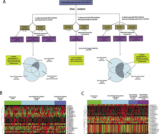 Most studies investigating lncRNAs involved in HCC were limited by the small size of patient cohorts and the lack of specific HCC etiology focus, with many studies comparing only tumor samples with normal samples [1]. While there have been studies exploring differential gene expression for coding genes in HCC caused by different risk facts, to the best of our knowledge, no study has compared the role of lncRNAs in HBV/HCV- related HCC to their role in alcohol-related HCC. We downloaded RNA-sequencing data for 222 HCC patients from The Cancer Genome Atlas (TCGA) database to obtain a substantial cohort for analysis. We then analyzed lncRNA expression levels of patient normal samples versus that of three tumor sample cohorts, based on HBV infection, HCV infection, and history of alcohol consumption. Finally, the expressions of selected lncRNAs were verified in vitro.