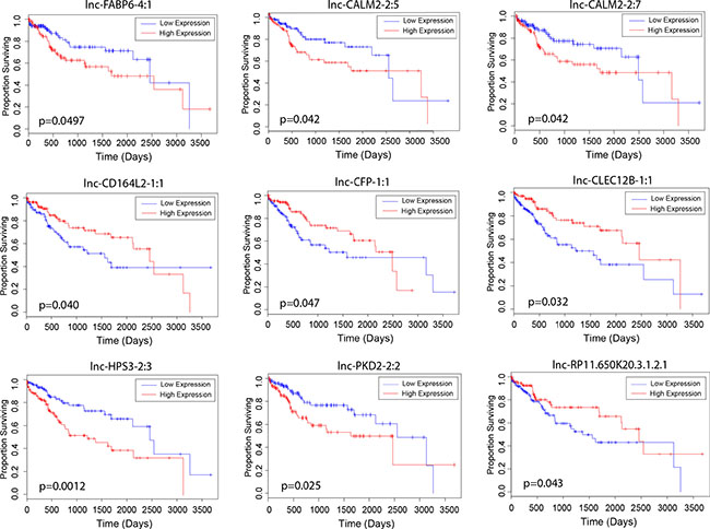 To explore the clinical significance of lncRNAs identified in the differential expression analyses, we examined the relationship between their expression levels and overall patient survival. Modeling lncRNA expression as a binary variable (high/low), we found that relative high expression of five unregulated lncRNAs (lnc-FABP6-4:1, lnc-CALM2-2:5, lnc-CALM2-2:7, lnc-HPS3-2:3 and lnc-PKD2-2:2) and four downregulated lncRNAs (lnc-CD164L2-1:1, lnc-CFP-1:1, lnc-CLEC12B-1:1 and lnc-RP11.650K20.3.1.2.1) significantly associated with poor patient survival (p < 0.05) (Figure 2). Further, we correlated the expression of these genes to key clinical outcomes such as vital status, tumor grade and pathological tumor stage. Three lncRNAs (lnc-CLEC12B-1:1, lnc-HPS3-2:3 and lnc-RP11.650K20.3.1.2.1) significantly correlated with patient vital status (p < 0.05). Notably, stage-dependent correlation was observed between the expression level of two lncRNAs, lnc-FABP6-4:1 and lnc-CD164L2-1:1, and tumor grade, a grading system that characterizes level of differentiation of malignant cancer cells. Lastly, stage-dependent correlation was also found between lnc-CFP-1:1 and pathologic tumor stage, a staging system describing the development of liver cancer in terms of pathology.