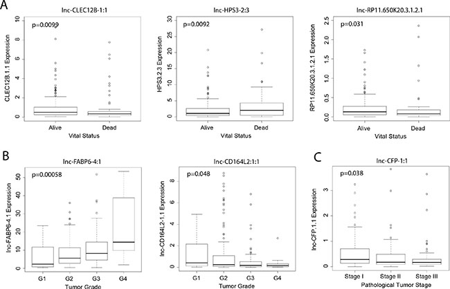 Figure 3: Association of lncRNA expression with clinical outcomes. Boxplots correlating expression of lncRNAs (counts-per-million) to (A) vital status, (B) tumor grade, and (C) pathologic tumor stage (Wilcoxon rank sum, p < 0.05).