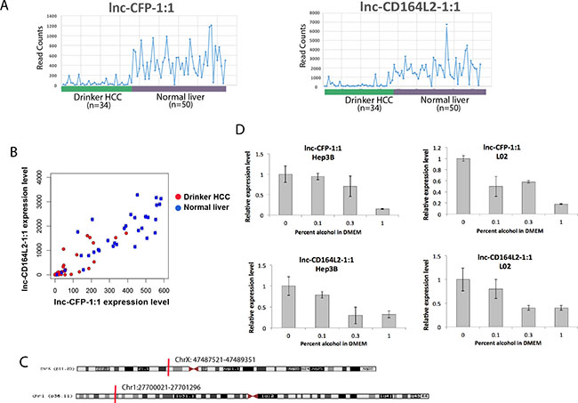Figure 6: In vitro validation of alcohol-dysregulated lncRNAs in liver cell lines. (A) Expression plot of lnc-CFP-1:1 and lnc-CD164L2-1:1 in HCC drinkers compared to normal liver tissues. (B) Scatter plots showing clusters of HCC drinkers and normal liver tissues with respect to expression levels of lnc-CFP-1:1 and lnc-CD164L2-1:1. (C) Loci of lnc-CFP-1:1 and lnc-CD164L2-1:1. (D) qRT-PCR verifies that 0.1%, 0.3% and 1% alcohol treatment downregulates lnc-CFP-1:1 and lnc-CD164L2-1:1 in L02 and Hep3B. All bar graphs are presented as the mean and error bars representing standard deviations.