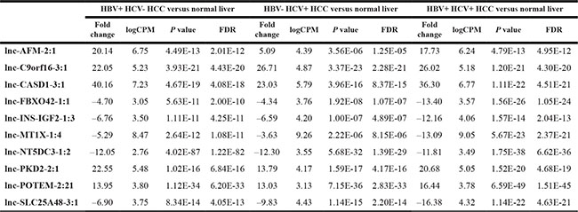 Table 1: Significantly dysregulated lncRNAs in alcohol comparisons for HBV+ patients
