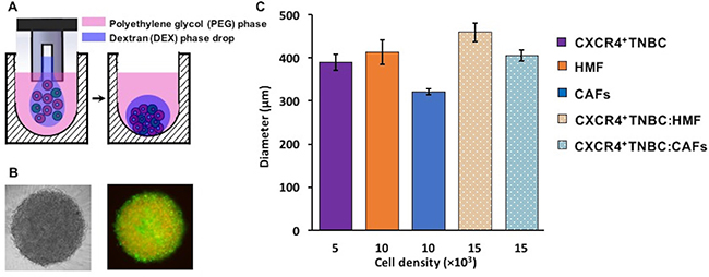 Figure 1: (A–B) Cancer cells remain confined in the 0.3 μl DEX phase drop (purple) suspended in the immiscible immersion PEG phase (pink) and autonomously aggregate to form a co-culture spheroid of triple negative breast cancer cells (green) and human mammary fibroblasts (red) in 48 hrs. Colors in panel (A) are for presentation purpose only. (C) Resulting spheroids of different co-culture models are consistently sized with low standard errors.