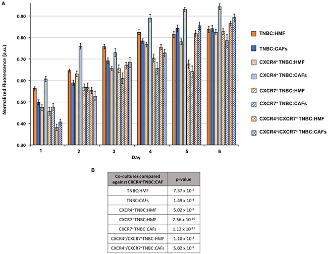 Figure 2: (A) Growth of co-culture spheroids based on metabolic activity measurements is shown over a six-day period. Spheroids consist of 1.5 × 104 cells at a ratio of 1:2 TNBC:fibroblasts at the starting point of experiments. (B) p-values from a statistical test show that the CXCR4+TNBC:CAFs co-culture model is consistently and significantly more proliferative than all the other models.
