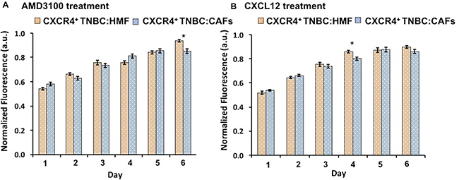 Figure 3: (A) Treatment of CXCR4+TNBC:CAFs co-culture spheroids with AMD3100 (CXCR4 antagonist) normalizes proliferation to level of the CXCR4+TNBC:HMF co-culture. (B) Treating CXCR4+TNBC:HMF co-culture spheroids with CXCL12-containing conditioned medium from CAFs stimulates proliferation to that of CXCR4+TNBC:CAF co-culture spheroids.