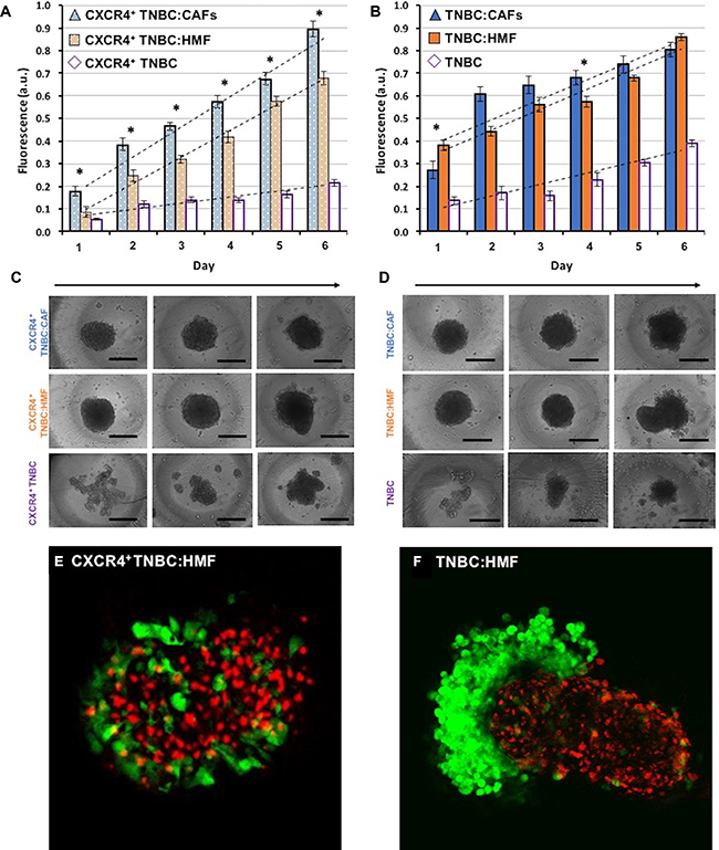 Figure 4: Proliferation of TNBC cells in co-culture spheroids measured using their endogenous eGFP signal. (A) TNBC cells in the CXCR4+TNBC:CAFs model display consistently greater proliferation compared to spheroids of CXCR4+TNBC:HMF co-culture model and CXCR4+TNBC single culture with a larger slope of 11.4% and 77.1%, respectively. (B) TNBC cells lacking CXCR4 expression in co-culture with HMF and CAFs show a similar proliferation. (C–D) Morphology of resulting co-culture spheroids and mono-culture spheroids of breast cancer cells on days 1, 3, and 6 (left to right). Error bars represent standard error of mean. (E–F) Confocal images of the co-culture spheroids containing HMF cells on day 4. Scale bar is 200 μm. *p < 0.05.
