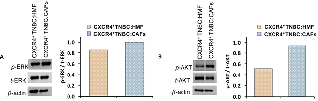 Figure 6: Western blot analysis of signaling proteins (A) p-ERK and (B) p-AKT in co-cultures of CXCR4+TNBC cells with HMF and CAFs. Quantified data were normalized to β-actin protein expression.