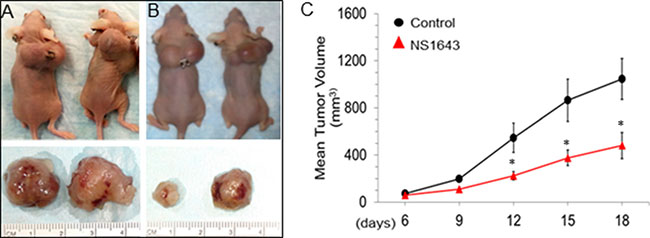 Figure 3: Kv11.1 stimulation inhibits primary tumor growth in xenograft model of breast cancer. MDA-MB-231 (ATCC®) cells were injected subcutaneously into the flanks of female athymic nude mice. When tumors were palpable the mice were injected intraperitoneally with vehicle alone or Kv11.1 activator NS1643 at 6 mg/kg every two days. (A) Representative mice with tumor burdens treated with vehicle (DMSO) alone. (B) Representative mice with tumor burdens treated with Kv11.1 activator NS1643. (C) Mean tumor volume in mice treated with vehicle alone (control N = 6) and in mice treated with Kv11.1 activator (NS1643 N = 6). Data is expressed as Mean ± SEM; *p < 0.05.