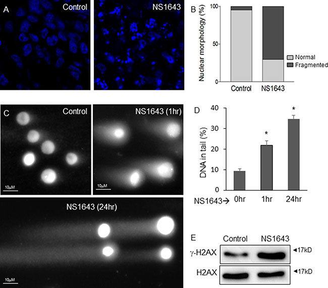 Figure 6: NS1643 generates DNA damage in breast cancer. (A) Single confocal sections of DAPI-stained tumors from control and NS1643-treated mice show fragmentation of nuclei indicative of DNA damage induced by NS1643 treatment. The number of normal (light grey) vs. fragmented (dark grey) nuclei was quantified by manual counting (n = 4, p < 0.001, (B) Light vs Dark represents normal vs fragmented nuclei. (C) Representative images of human MDA-MB-231 cells subjected to neutral comet assay after treatment with NS1643 (50 μM) for 0 hr, 1 hr or 24 hr. (D) Quantification of DNA in tail (percent) of cells treated as indicated. Data is expressed as mean ± SEM; Unpaired t-test. *p < 0.05 (E) Western blot analyses of phosphorylated γH2AX in MDA-MB-231 cells treated with NS1643 (50 μM) for 30 min compared to control (DMSO).