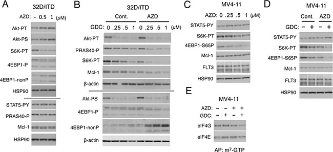 Figure 2: Inhibition of Pim kinases and PI3K cooperatively down regulates the mTORC1/Mcl-1 pathway in FLT3-ITD-expressing cells. (A) 32D/ITD cells were cultured for 6 h with indicated concentrations of AZD1208 (AZD) and lysed. Cell lysates were run on duplicate gels and subjected to Western blot analysis with antibodies against indicated proteins. The results obtained from duplicate gels are shown above or below a thin horizontal line. Abbreviations: Akt-PT, phospho-T308-Akt; Akt-PS, phospho-S473-Akt; S6K-PT, phospho-T389-p70S6 kinase; 4EBP1-P, phospho-T37/46-4EBP1; 4EBP1-nonP, non-phospho-T46-4EBP1; STAT5-PY, phospho-Y694-STAT5; PRAS40-P, phospho-T246-PRAS40. (B) 32D/ITD cells were cultured for 6 h with indicated concentrations of GDC-0941 (GDC) in the presence or absence of 1 μM AZD1208 (AZD), as indicated, and analyzed as in A. (C) MV4-11 cells were cultured for 18 h with indicated concentrations of AZD1208 (AZD) and analyzed. 4EBP1-S65P: phospho-S65-4EBP1. (D) MV4-11 cells were cultured for 18 h with or without 0.25 μM GDC-0941 (GDC) and 1 μM AZD1208 (AZD), as indicated, and analyzed. (E) MV4-11 cells were cultured for 6 h with 0.25 μM GDC-0941 (GDC) or 1 μM AZD1208 (AZD), as indicated, and subjected to the cap-binding assay to analyze the eIF4E/eIF4G complex formation. Proteins affinity purified (AP) with m7-GTP-sepharose (m7-GTP) were subjected to Western blot analysis.