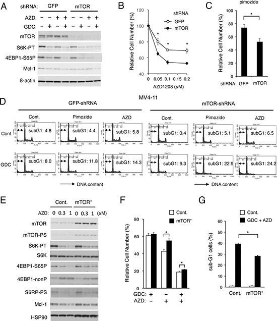 Figure 3: Apoptosis induced cooperatively by inhibitors for PI3K and Pim kinases is mediated through downregulation of mTOR. (A) MV4-11 cells transduced with shRNA targeting for GFP or mTOR, as indicated, were lysed and subjected to Western blot analysis with antibodies against indicated proteins. Abbreviations: S6K-TP, phospho-T389-p70S6 kinase; 4EBP1-S65P, phospho-S65-4EBP1. (B, C) MV4-11/GFP-shRNA or MV4-11/mTOR-shRNA cells, as indicated, were cultured for 48 h with indicated concentrations of AZD1208 (B) or 2.5 μM pimozide (C). The means of relative viable cell numbers, expressed as percentages of control cells without inhibitors, from triplicate measurements are plotted with error bars indicating standard errors. The asterisks indicate statistically significant differences determined by Student’s t-test (*P < 0.05). (D) MV4-11/GFP-shRNA or MV4-11/mTOR-shRNA cells, as indicated, were treated for 48 h with indicated concentrations of GDC-0941 (GDC), pimozide, or AZD1208 (AZD) and analyzed for the cellular DNA content by flow cytometry. Percentages of apoptotic cells with sub-G1 DNA content are indicated. (E) 32D/ITD cells transduced with the activated mTOR mutant mTOR-E2419K (mTOR*) or vector control cells (Cont.), as indicated, were treated for 6 h with indicated concentrations AZD1208 (AZD) and subjected to Western blot analysis with antibodies against indicated proteins. Abbreviations: mTOR-PS, phospho-S2481-mTOR; S6K-PT, phospho-T389-p70S6 kinase; S6K, p70S6 kinase; 4EBP1-nonP, non-phospho-T46-4EBP1; S6RP-PS, phosphor-S240/244-S6RP. (F) 32D/ITD cells expressing mTOR-E2419K (mTOR*) or vector control cells (Cont.) were cultured for 48 h with 0.5 μM GDC-0941 (GDC) or 0.5 μM AZD1208 (AZD), as indicated, in triplicate. The means of relative viable cell numbers, expressed as percentages of control cells without inhibitors, from triplicate measurements are shown with error bars indicating standard errors. The asterisks indicate statistically significant differences determined by Student’s t-test (*P < 0.05). (G) 32D/ITD cells expressing mTOR-E2419K (mTOR*) or vector control cells (Cont.) were cultured for 48 h with or without 3 μM GDC-0941 and 2 μM AZD, as indicated, in triplicate, and analyzed for the cellular DNA content by flow cytometry. The means of percentages of apoptotic cells with sub-G1 DNA content are shown with error bars indicating standard errors. The asterisks indicate statistically significant differences determined by Student’s t-test (*P < 0.05).