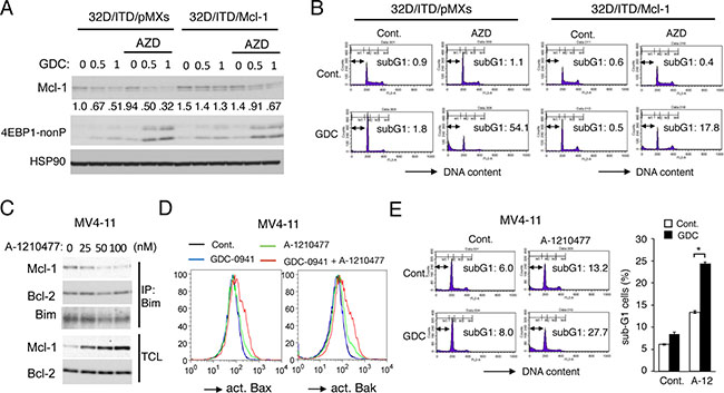 Figure 4: Mcl-1 mediates the acquisition of resistance to PI3K inhibition downstream of Pim kinases in FLT3-ITD-expressing cells. (A) 32D/ITD cells transduced with Mcl-1 (32D/ITD/Mcl-1) or vector control cells (32D/ITD/pMXs), as indicated, were treated for 6 h with indicated concentrations of GDC-0941 (GDC) with or without 1 μM AZD1208 (AZD), as indicated, and subjected to Western blot analysis with antibodies against indicated proteins. 4EBP1-nonP: non-phospho-T46-4EBP1. Relative expression levels of Mcl-1 were determined by densitometric analysis and are shown below the panel. (B) 32D/ITD/pMXs or 32D/ITD/Mcl-1 cells were treated for 48 h with 3 μM GDC-0941 (GDC) or 1 μM AZD1208 (AZD), as indicated, and analyzed for the cellular DNA content by flow cytometry. Percentages of apoptotic cells with sub-G1 DNA content are indicated. (C) MV4-11 cells were cultured for 6 h in serum free medium with indicated concentrations of A-1210477. Total cell lysates (TCL) and immunoprecipitates (IP) with anti-Bim antibody were subjected to immunoblot analysis using indicated antibodies. (D) MV4-11 cells were treated in serum free medium for 24 h with 1 μM GDC-0941 or 50 nM A-1210477, as indicated, and subjected to flow cytometric analyses for activation of Bax or Bak, using activation-specific antibodies. (E, F) MV4-11 cells were cultured in serum free medium for 24 h with 0.5 μM GDC-0941 or 25 nM A-1210477, as indicated, and analyzed for the cellular DNA content by flow cytometry. Percentages of apoptotic cells with sub-G1 DNA content are indicated in representative data, and the means of triplicate measurements are plotted with error bars indicating standard errors. The asterisks indicate statistically significant differences determined by Student’s t-test (*P < 0.05).