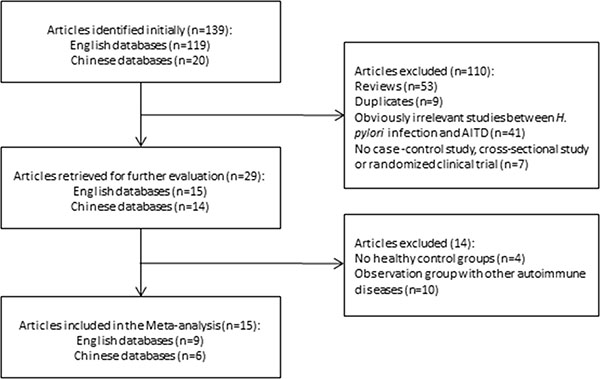 Articles or publications were excluded where (1) Insufficient information was provided to support the association of H. pylori infection with AITD in the full text publication or abstract where full text manuscripts were not available; (2) The same data was reported in several publications; (3) The study did not include a control group.