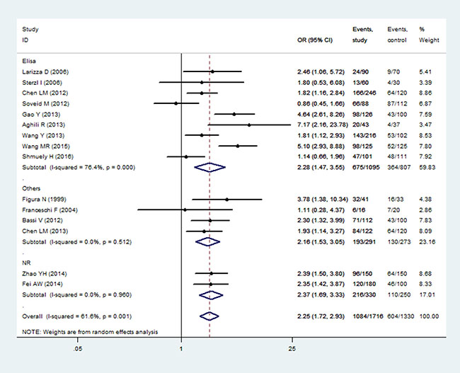 Figure 3: Correlation analysis of H. pylori infection with AITD by different detection methods. Note: AITD, autoimmune thyroid diseases; Elisa, enzyme-linked immunosorbent assay; Others, other methods for detecting H. pylori infection; NR, no reported.