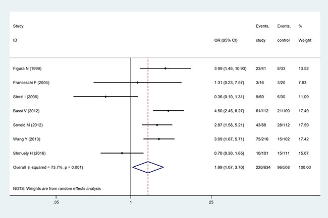 The rates of infection with CagA-positive H. pylori strains were reported in seven studies. Heterogeneity was observed among the rates in these studies (I2 = 73.7%, p = 0.001). According to random model calculation, the rate of H. pylori infection was 34.70% in the observation group and 18.90% in the control group (OR = 1.99, 95% CI: 1.07–3.70, p = 0.030), indicating that infection with CagA-positive H. pylori strains was associated with AITD (Figure 5). Consistent with this analysis, there was heterogeneity in the statistical results and sensitivity analysis. Systematic evaluation was carried out in a manner similar to that described previously. By excluding the studies by Sterzl et al. [19] and Shumuely et al. [30], the merged effect significantly changed (OR = 3.35, 95% CI: 2.42–4.64) and the heterogeneity disappeared (I2 = 0%, p = 0.653), while the conclusion was still consistent (Supplementary Figure 2). Due to the limitations of the retrieved literature, meta-regression analysis was unable to identify the source of heterogeneity [31, 32].