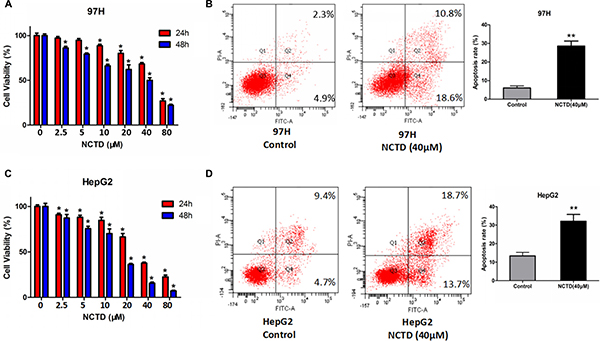 Figure 1: NCTD suppresses cell viability and promotes apoptosis in HCC cell lines. (A) Cell viability assay in 97H cells treated with NCTD (0, 2.5, 5, 10, 20, 40, 80 μM) for 24 or 48 h. (B) Flow cytometric analysis of apoptosis in 97H cells exposed to NCTD. NCTD (40 μM) significantly increased the apoptotic rate. (C) Cell viability assay in HepG2 cells. (D) Flow cytometric analysis of apoptosis in HepG2 cells treated with 40 μM NCTD. Data are expressed as mean ± SEM. *p < 0.05 and **p < 0.01 compared with the control group.
