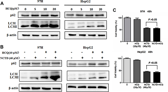 Next, we tested the effects of hydroxychloroquine (HCQ), which inhibits autophagy by impairing the lysosomal acidification of the autophagic cargo, blocking the fusion of autophagosomes with lysosomes [27]. As shown in Figure 3A, HCQ treatment strongly repressed autophagy, an effect reflected by increasing levels of both LC3 II and p62. However, in the presence of HCQ, a striking increase in LC3 II expression was still observed upon concurrent exposure to NCTD (Figure 3B). Moreover, addition of HCQ did not prevent the reduction in cell proliferation elicited by NCTD in 97H and HepG2 cells (Figure 3C), a result inconsistent with previous research [17]. These data indicate that NCTD-induced cell death could not be rescued by autophagy inhibition by HCQ.