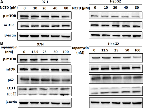 We then verified whether direct inhibition of mTOR signaling could facilitate the activation of autophagy in HCC cells by using the prototypic mTOR inhibitor rapamycin [29]. As shown in Figure 4B, no change in total mTOR was observed in rapamycin-treated 97H and HepG2 cells, compared with control. However, a modest decrease in mTOR phosphorylation, as well as accumulation of LC3 II and reduced expression of p62, indicated mTOR pathway blockade (Figure 4B). These data suggest that repression of mTOR signaling underlies the activation of autophagy by NCTD in HCC cells.