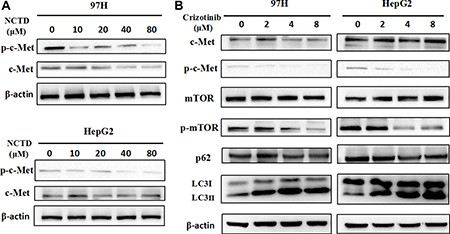 Figure 5: NCTD downregulates the c-Met signaling pathway. (A) Western blot analysis of c-Met and p-Met in HHC cells treated with NCTD (0, 10, 20, 40, 80 μM) for 48 h. (B) Western blot analysis of c-Met, p-Met, mTOR, p-mTOR, p62, and LC3 in 97H and HepG2 cells treated with crizotinib (0, 2, 4, 8 μM).