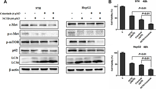 Figure 6: Crizotinib enhances NCTD cytotoxicity. (A) Western blot determination of LC3 levels. NCTD (40 μM) combined with crizotinib (4 μM) significantly increased the expression of the autophagy maker LC3 through suppression of the mTOR signaling pathway. (B) Cell viability analysis of 97H and HepG2 cells treated with NCTD, crizotinib, or both drugs in combination. Data are expressed as mean ± SEM.