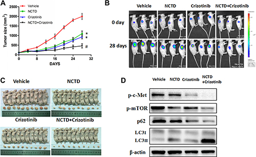 Figure 7: NCTD alone or combined with crizotinib inhibits tumor growth in a xenograft mouse model. (A) Effects of NCTD, alone or in combination with crizotinib, on tumor growth. (B) Representative bioluminescence tumor imaging. (C) The images of nude mice and tumors are shown (D) Western blotting analysis of excised tumors. Data are expressed as mean ± SEM. *p < 0.01 compared with the Vehicle group, and #p < 0.01 compared with the NCTD or crizotinib group.