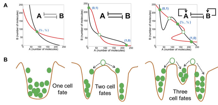 Figure 1: Symmetry breaking in mutually inhibitory feedback loops (from Jolly et al). Different levels of mutual inhibition and self-activation between two molecules, A and B, results in symmetry breaking from the configuration of equal numbers of A and B to bistability and tristability. In the tristable configuration, the intermediate state could represent a hybrid cell state. Red and black curves describe nullclines for A and B, and their intersections are the steady states. Green filled circles represent stable steady states, and green hollow circles show unstable steady states. For more information, see Jolly et al, 2015.