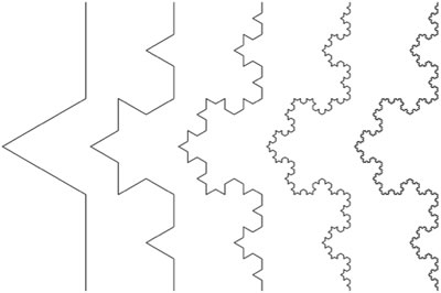 Figure 2 : The Koch curve. The Koch curve is created by dividing each line segment into thirds and replacing the middle segment with an equilateral triangle. Each iteration of the Koch curve produces a curve that is self-similar to the previous ones. It can be readily shown that the total length scales the power law relationship (4/3)n for n iterations and thus the length approaches infinity in the limit. The fractal dimension of a Koch curve is defined as log4/log3 = 1.2619. The Koch curve is continuous, but not differentiable, i.e., it has no tangent at any point.