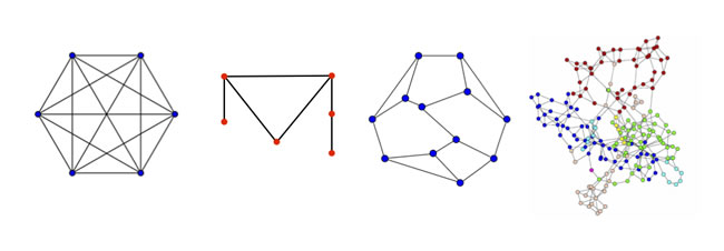 Figure 3: Graphs of differing symmetry. Graph 1 is a complete graph with all nodes connected; it has 6 rotation and 12 reflection symmetries. Graph 2 is the smallest asymmetric graph. Graph 3 is the smallest asymmetric graph with each node possessing 3 edges (degree 3); it is known as the Frucht graph. Graph 4 is a complex graph, such as might exist for interacting proteins, for which any imbedded symmetries are difficult to discern by inspection. Software programs, such as nauty and SAUCY2, can compute the graph automorphisms.