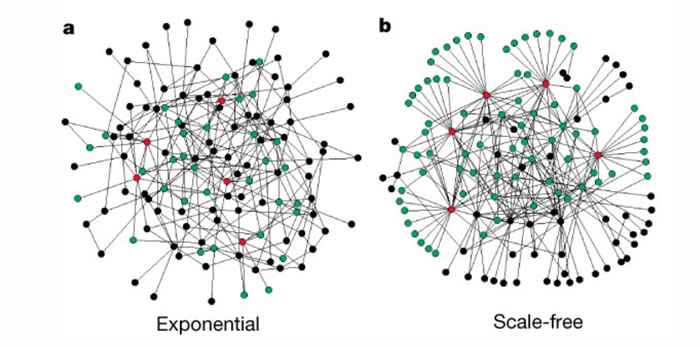 Figure 4: Visual illustration of the difference between an exponential and a scale-free network (from Albert et al). a, The exponential network is homogeneous: most nodes have approximately the same number of links. b, The scale-free network is inhomogeneous: the majority of the nodes have one or two links but a few nodes have a large number of links, guaranteeing that the system is fully connected. Red, the five nodes with the highest number of links; green, their first neighbours. Although in the exponential network only 27% of the nodes are reached by the five most connected nodes, in the scale-free network more than 60% are reached, demonstrating the importance of the connected nodes in the scale-free network Both networks contain 130 nodes and 215 links ((k)=3.3). For additional information see Albert et al, Nature 2000.