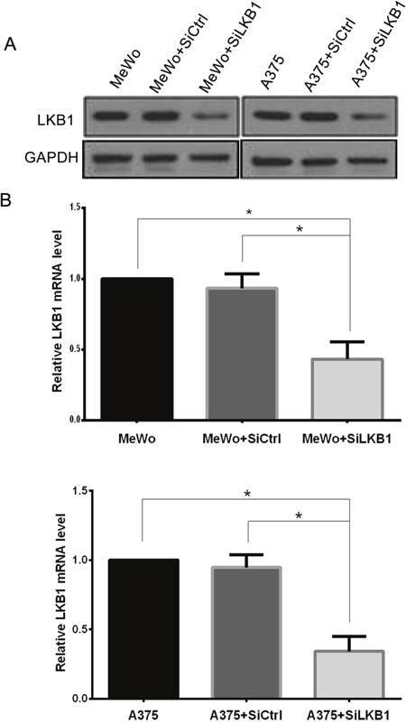 Figure 1: Knockdown of LKB1 in A375 and MeWo cells was confirmed by western blot analysis and qRT-PCR. (A) LKB1 protein level was detected by western blot analysis. (B) LKB1 mRNA level was measured by qRT-PCR. Data are obtained from 3 independent experiments and shown as means±SD of triplicate experiments. *p<0.05.