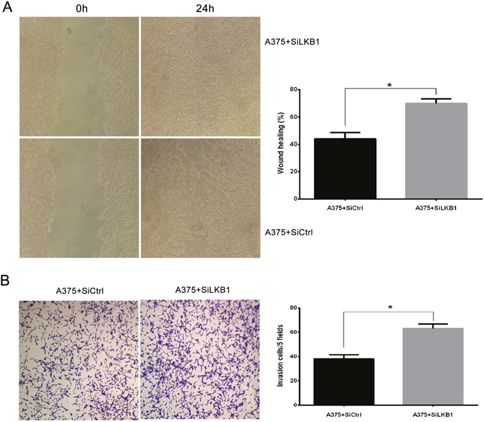 Figure 2: LKB1 loss alone is insufficient to influence the migration and invasion behavior of MeWo cells. MeWo cells were transiently transfected with SiLKB1 and SiCtrl respectively and performed further test 3 days after transfection. (A) Cell migration was detected by wound scratch assay. Quantification was carried out by calculating the percentage of cell coverage to the scratch zone at 0 and 24h. Values are means±SD of triplicate experiments. (B) Cell invasion was tested by Transwell assay. Invaded cells were stained with crystal violet and photographed at×40 magnification. Quantification was carried by counting the number of invaded cells per 5 fields under microscope. Data are obtained from 3 independent experiments and shown as means±SD of triplicate experiments(*p<0.05).
