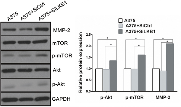 Figure 4: Knockdown of LKB1 expression in BRAF V600E melanoma cells increased cell invasion via up-regulating MMP2 secretion through PI3K/Akt/mTOR pathway. The expression of MMP-2、phosphorylated Akt and phosphorylated mTOR were all enhanced in LKB1 knockdown A375 cells compared with A375 and A375+siCtrl cells (*p<0.05).