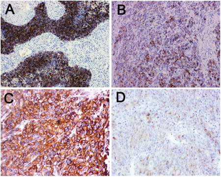 Figure 5: Immunohistochemical staining for LKB1 and MMP-2 in human melanoma tissue. (A) Melanoma tissue showing LKB1high level expression at magnification×100. LKB1 expression was localized in cytoplasm. (B) Melanoma tissue showing LKB1 low level expression at magnification×100. (C) Melanoma tissue showing MMP-2 high level expression at magnification×200, MMP-2 expression was localized in cytoplasm. (D) Melanoma tissue showing MMP-2 low level expression at magnification×200.