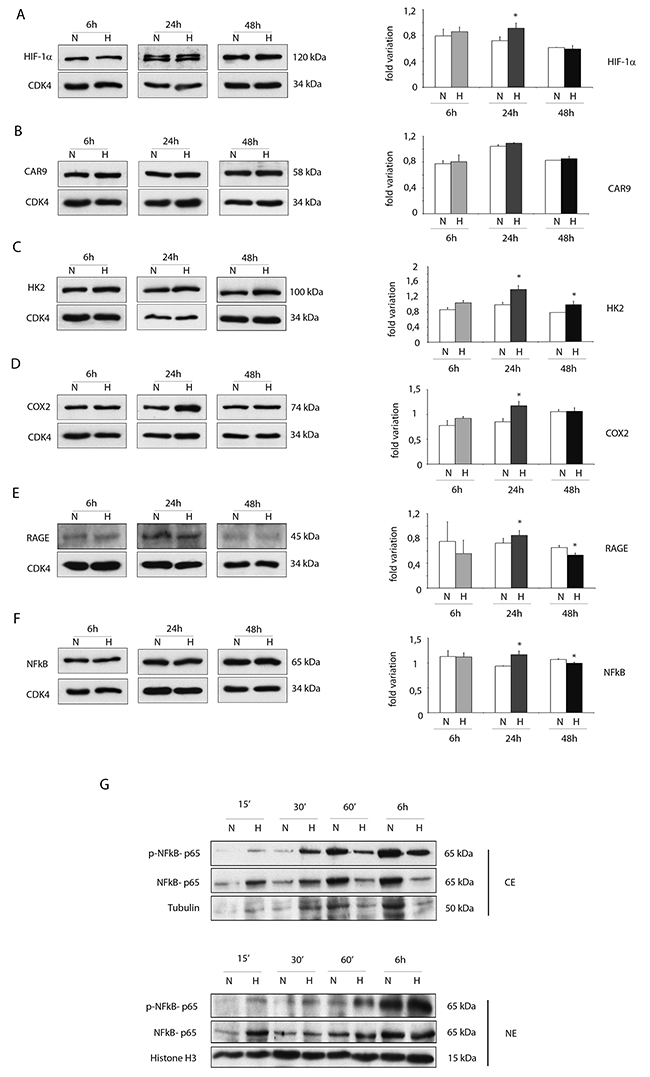 In particular, hypoxia increased the expression of HIF-1 α at 24h (Figure 3A). Noteworthy, the protein expression of the transporter carbonic anhydrase 9 (CAR9) was slightly increased at 6 and 24h while the metabolic enzyme hexokinase 2 (HK2), regulated by HIF-1 α as CAR9, was significantly increased following 24h and 48h of hypoxia (Figure 3B and 3C). The expression of COX2 and RAGE was increased after 24h of hypoxia but the expression of RAGE was significantly reduced after 48h of hypoxia (Figure 3D and 3E). Hypoxia increased the expression of NFkB p65 subunit (NFkB p65) at 24h (Figure 3F) and, most importantly, induced its activation as showed in Figure 4G. Specifically, Western blot analysis showed that hypoxia induced the phosphorylation of cytoplasmic NFkB p65 within the first 30 min and its nuclear translocation in a time-dependent manner (Figure 3G).