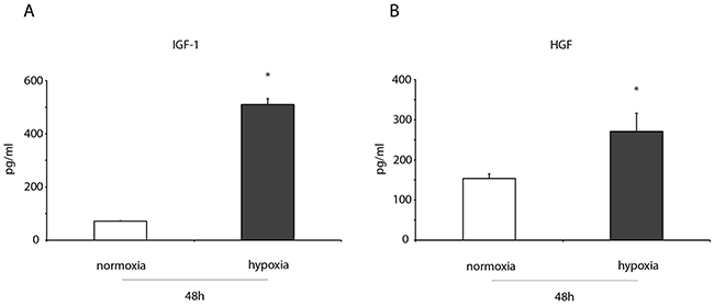 ELISA assays were performed to measure the levels of two growth factors, both involved in cardioprotection, in the conditioned medium of normoxic and hypoxic ckit+CSCs. After 48h of hypoxia, we detected a significant increase in IGF-1 (Figure 4A) and HGF levels (Figure 4B) in conditioned media of hypoxic ckit+CSCs compared to normoxia.
