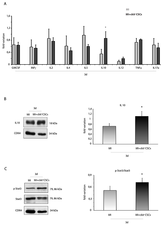 Since activation of the IRR leads to protection and repair of damaged cells, we hypothesized that following transplantation into the infarcted myocardium, ckit+CSCs would exert a cardioprotective effect by activating this pathway. To test this hypothesis, ckit+CSCs were transplanted into the damaged heart of an ischemic mouse. Firstly, by Luminex assay, we detected circulating levels of different pro- and anti-inflammatory cytokines 3 days following surgery: we did not find significant differences among injected infarcted hearts and control infarcted hearts except for IL10, a potent anti-inflammatory cytokine, that resulted significantly up regulated in the ckit+CSC treated group (Figure 5A). This result was confirmed by WB analysis on the infarcted region of 3 day-infarcted hearts: we detected significantly enhanced expression levels of IL10 in ckit+CSC transplanted hearts compared to control hearts (Figure 5B). Further, comparing the samples from the same groups of animals, we also detected an increased phosphorylation of STAT3 following infarction and transplantation (Figure 5C).