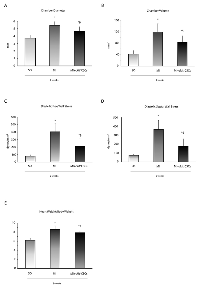 Figure 7: ckit+CSCs improve left ventricular remodeling. (A) LV chamber diameter, (B) LV chamber volume, (C) diastolic free wall stress, (D) diastolic septal wall stress and (E) Heart weight/Body weight following MI. All measurements were obtained 2 weeks after ckit+CSC or PBS treatment. Results are presented as mean±SD (SO, n=7; MI, n=6; MI+ckit+CSCs, n=7; *p<0.05 vs SO; §p<0.05 vs MI).