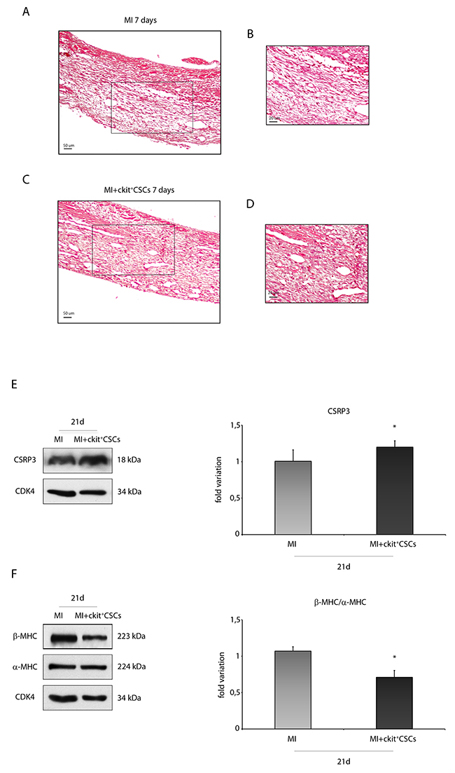 Figure 8: ckit+CSCs attenuate hypertrophy following acute MI. Representative H&E stained myocardial sections (A-D) of 7 day infarcted region from control (MI) (A) and ckit+CSC transplanted hearts (C). (B) and (D) represent high magnification of the insets shown in (A) and (C), respectively. The relative levels of (E) CSRP3 and (F) β-MHC/ α-MHC were investigated in the border zone of 21 day-infarcted control hearts (MI, n=3) or ckit+CSC transplanted hearts (MI+ckit+CSCs, n=3) by Western blot (left panel) and relative densitometry of three independent experiments (right panel). Data are shown as means ± SEM. *P < 0.05 vs MI.