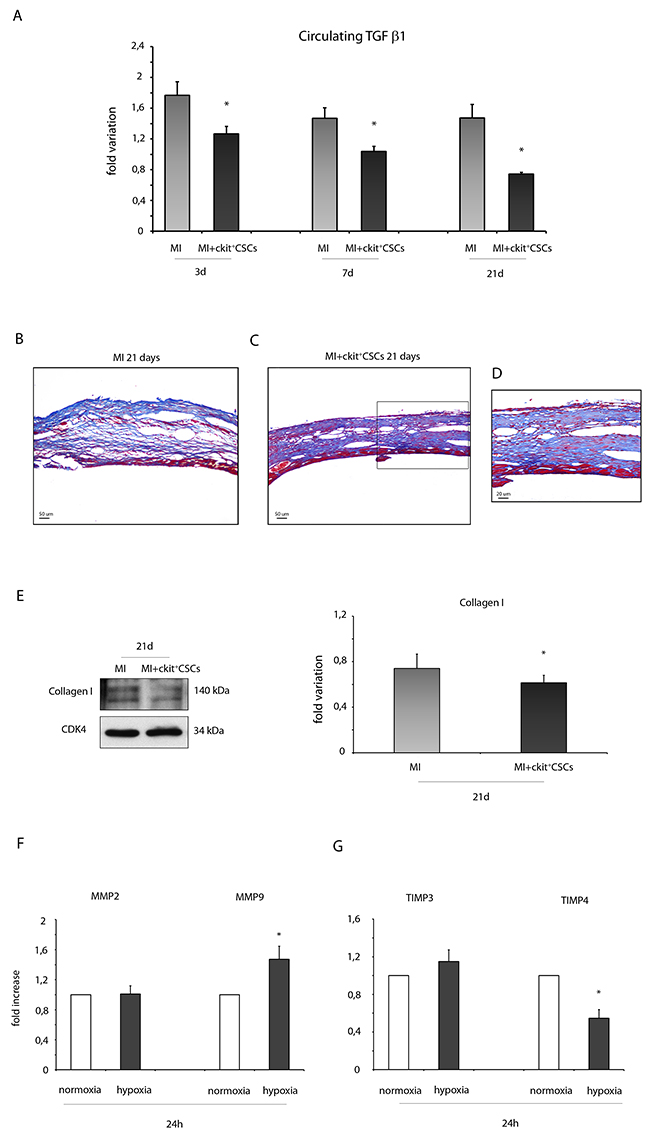Figure 9: ckit+CSCs reduce the expression of fibrotic markers. (A) Circulating levels of TGF β1 detected by Luminex assay 3, 7 and 21 days following surgery in the serum of PBS treated infarcted mice used as controls (MI, n=4) and ckit+CSC transplanted infarcted mice (MI+ckit+CSCs, n=4), all normalized for their controls. Data are shown as means ± SEM. *P<0.05 vs MI. (B-D) Representative Azan-Mallory staining photomicrographs of control (MI) (B) and ckit+CSC transplanted infarcted hearts (MI+ckit+CSCs) (C, D) depicting fibrosis (blue area), 21 days after treatment. (D) represents high magnification of the insets shown in (C). (E) Collagen I expression in 21 day-infarcted control hearts (MI, n=3) or ckit+CSC transplanted hearts (MI+ckit+CSCs, n=3) by Western blot (left panel) and relative densitometry of 3 independent experiments (right panel). Data are shown as means ± SEM. *P < 0.05 vs MI. (F) MMP2 and MMP9, (G) TIMP3 and TIMP4 mRNA expression by real time PCR in normoxic and hypoxic ckit+CSCs at 24h. Data were normalized to GUSB, a housekeeping gene and represent means ±SEM; Data were obtained from 3 independent experiments. *p< 0.02 vs normoxic ckit+CSCs.