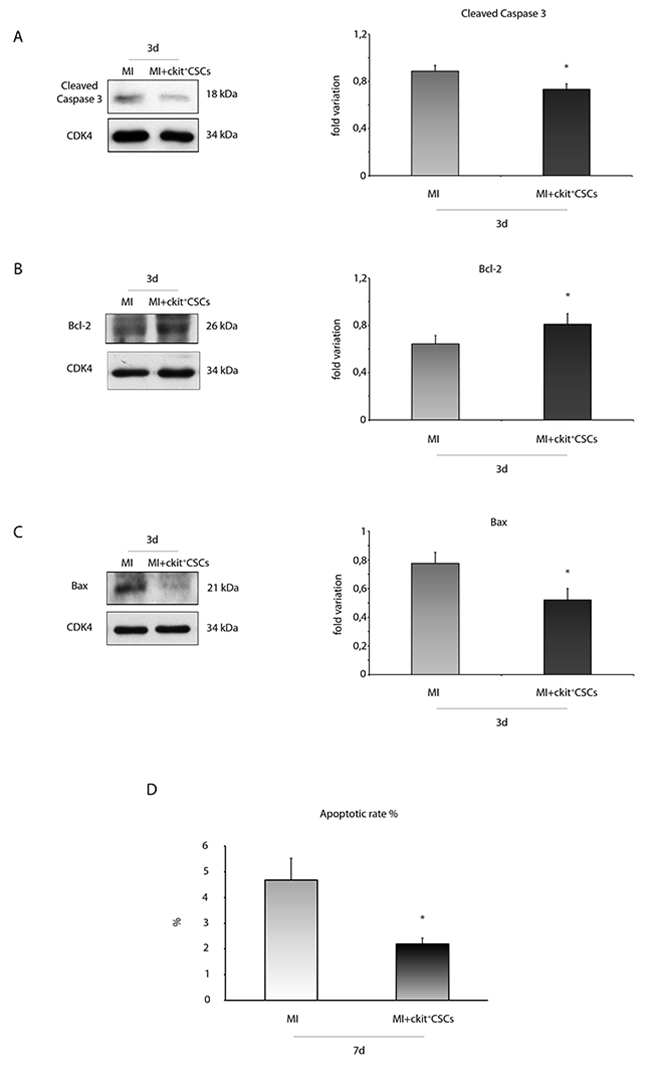Figure 10: ckit+CSCs modulate the expression of apoptotic markers in treated infarcted hearts. Western blot analysis showing the expression of (A) cleaved-caspase 3, (B) Bcl-2 and (C) Bax, in the border zone of 3 day-infarcted control hearts (MI, n=3) or ckit+CSC transplanted hearts (MI+ckit+CSCs, n=3). Left panel: A representative Western blotting of three independent experiments is shown. Right panel: Densitometric analysis of Western blot. Data are shown as means ± SEM. *P < 0.05 vs MI. (D) Cardiomyocyte apoptosis measured by TdT assay. Bar graph showing apoptotic rate in the peri-infarct area of the myocardium of control (MI) and ckit+CSC transplanted infarcted (MI+ckit+CSCs) hearts. Data represent means±SD (MI, n=5; MI+ckit+CSCs, n=5; *p<0.0052 vs MI).